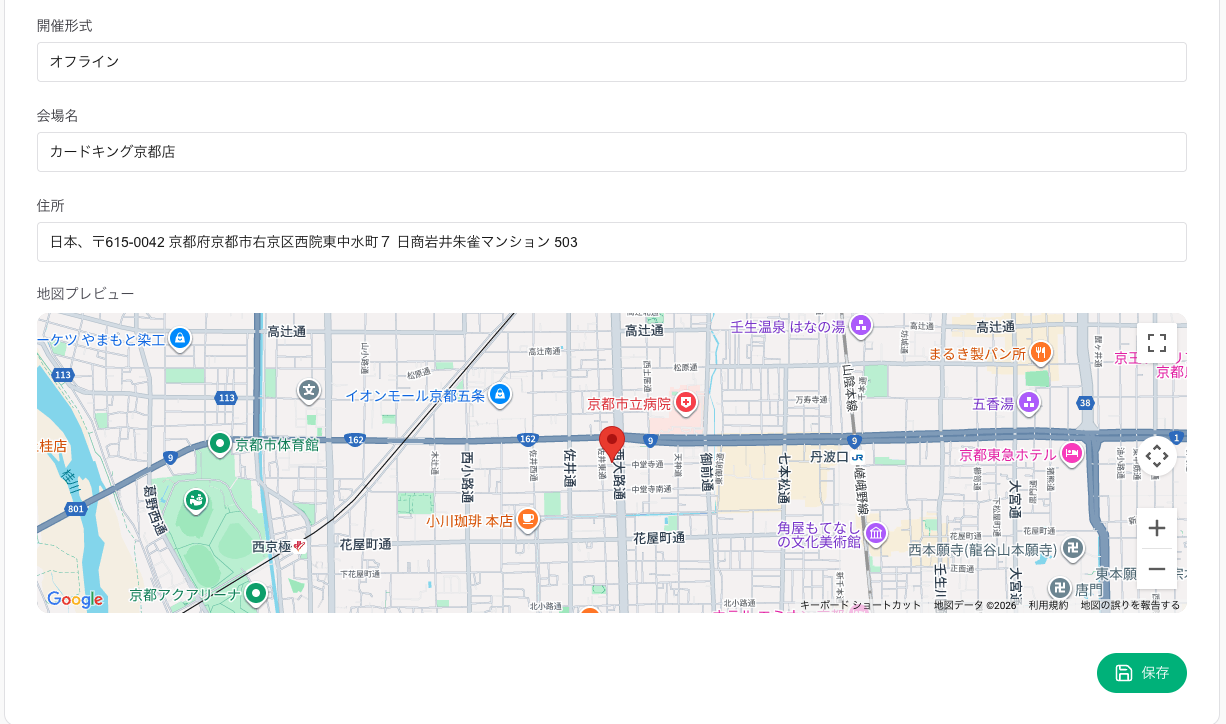 オフライン開催の場合、会場名と住所を入力できます。 オンライン開催の場合は、使用するプラットフォームやURLを記載することをお勧めします。