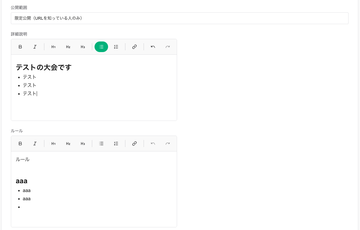 誰でもページを閲覧でき、大会一覧にも表示されます。一般参加を募集する大会に適しています。