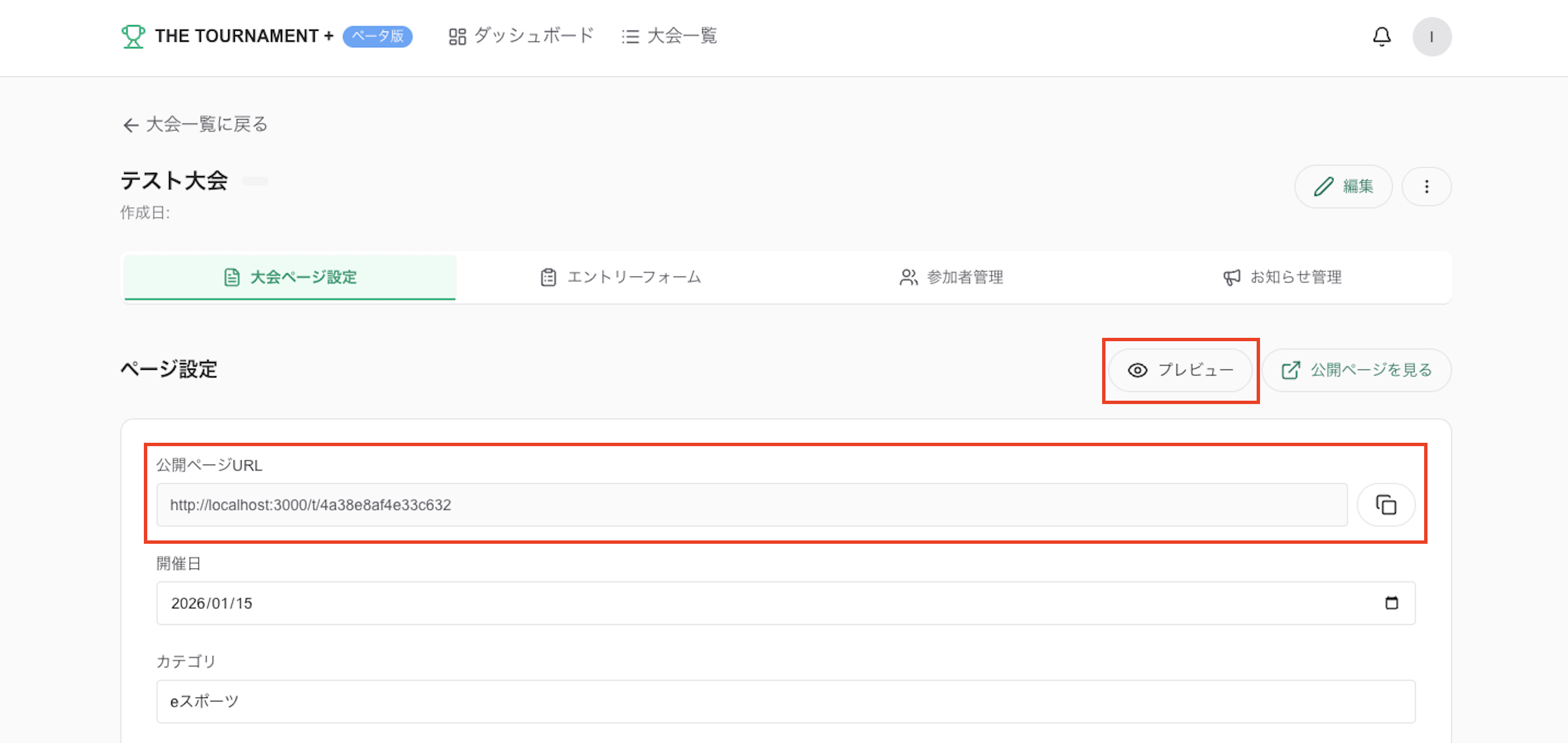 大会の公開ページには固有のURLが割り当てられます。
