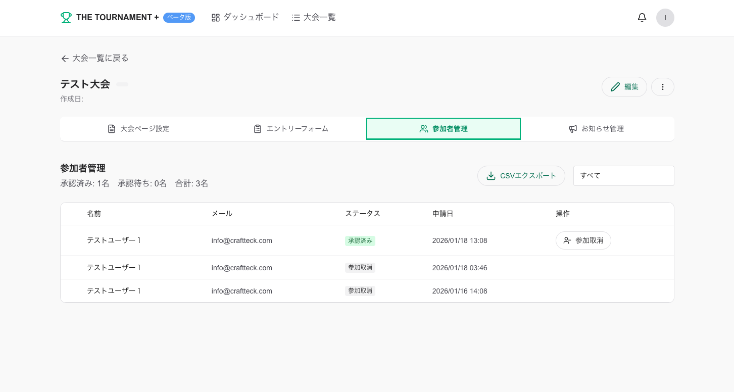 「参加者」タブでは、エントリーした参加者の一覧を確認できます。