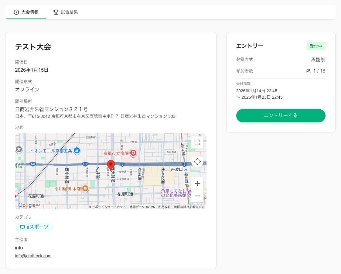 主催者から共有されたURLにアクセスするか、大会一覧から大会ページを開きます。